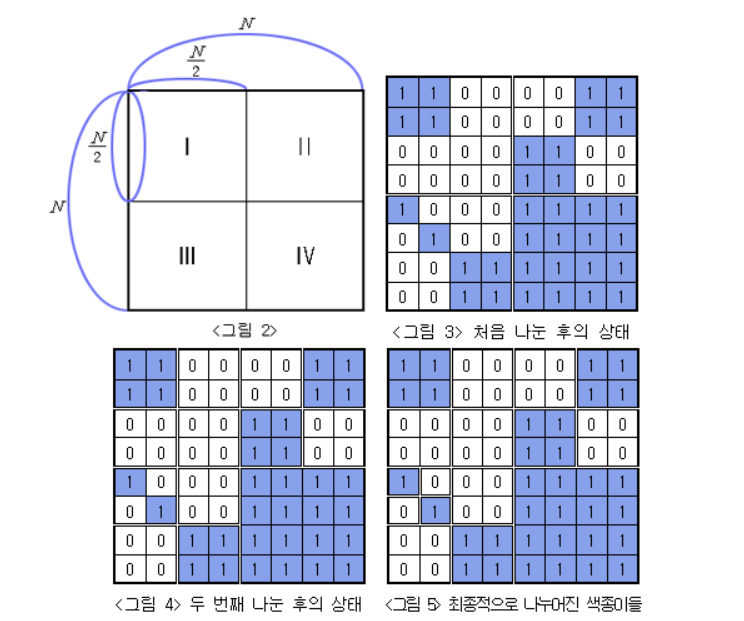 첫째 줄에는 전체 종이의 한 변의 길이 N이 주어져 있다. N은 2, 4, 8, 16, 32, 64, 128 중 하나이다. 색종이의 각 가로줄의 정사각형칸들의 색이 윗줄부터 차례로 둘째 줄부터 마지막 줄까지 주어진다.