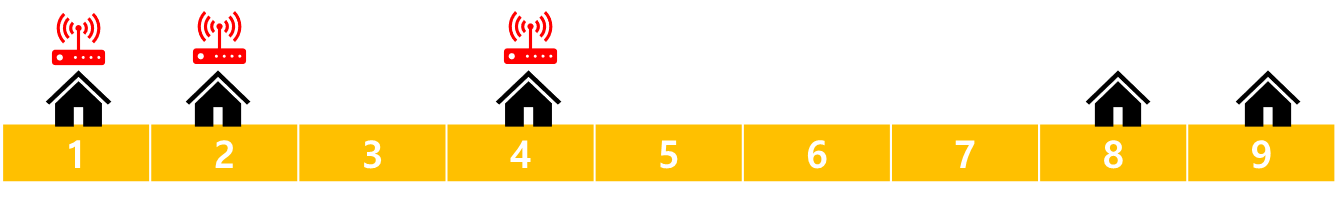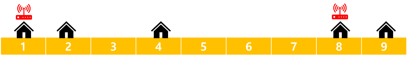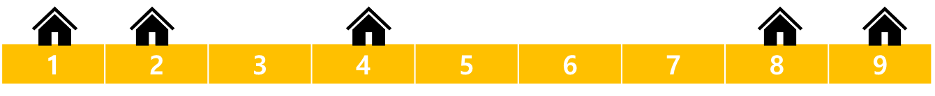 - 최대로 인접한 두 공유기 사이의 거리: 첫 번째 집과 마지막 집의 간격이 된다. 8