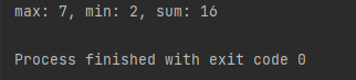 System.out.println("max: " + max + ", min: " + min + ", sum: " + sum);