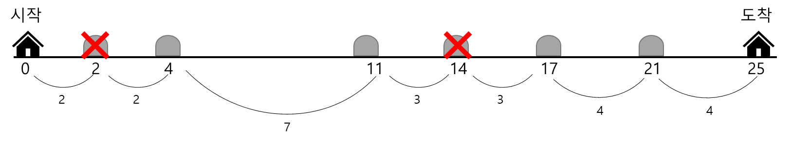 출발지점부터 distance만큼 떨어진 곳에 도착지점이 있습니다. 그리고 그사이에는 바위들이 놓여있습니다. 바위 중 몇 개를 제거하려고 합니다. 예를 들어, 도착지점이 25만큼 떨어져 있고, 바위가