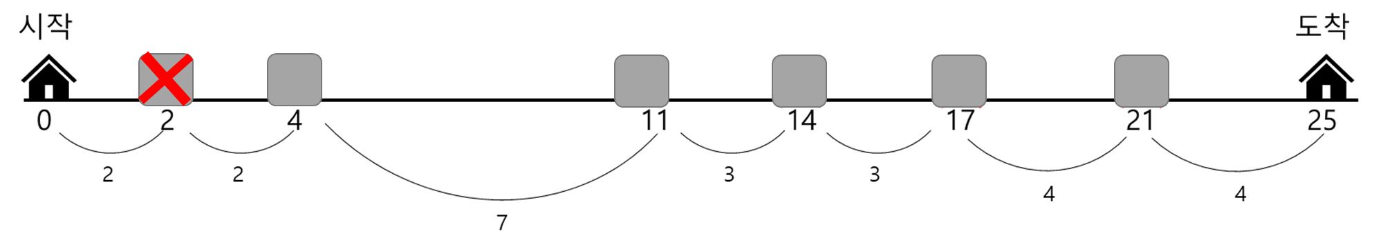 지점 간 최소 거리를 이분 탐색하면서 최대 값을 찾는 것이 핵심이다. 아래와 같이 징검 다리가 있다.