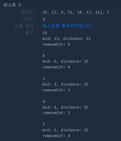 제거 바위가 N개를 초과하므로 right = mid -1 이 되고 right가 left보다 작아지면서 while 문이 종료된다.