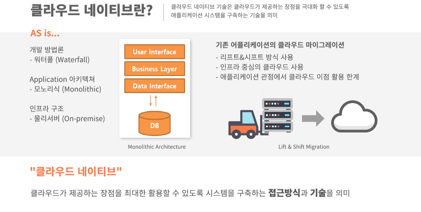 클라우드 네이티브를 설명하기에 앞서 과거의 어플리케이션 구축 방식을 살펴 보면, 차근차근 단계를 밟아나가는 워터폴 방식과 하나의 덩어리로 이루어지는 모노리식 구조와 온프레미스 방식으로 시스템을 구축해 왔다.